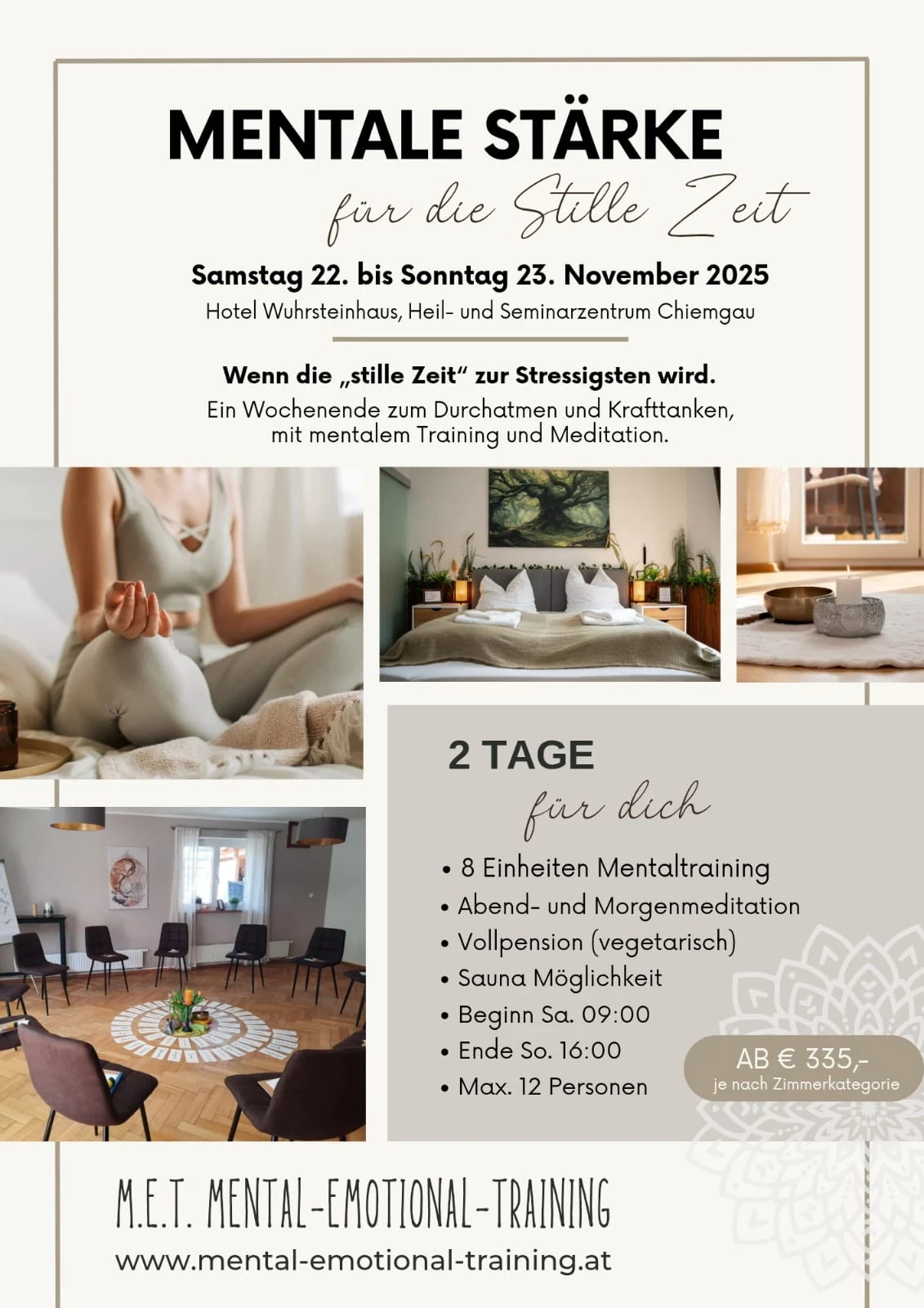 Dieses Seminarwochenende lädt dich ein, wieder mit dir selbst in Kontakt zu kommen. Erlebe mentale Trainingstechniken, achtsame Meditation und wirkungsvolle Strategien, um Stress abzubauen, Klarheit zu gewinnen und innere Ruhe zu finden.